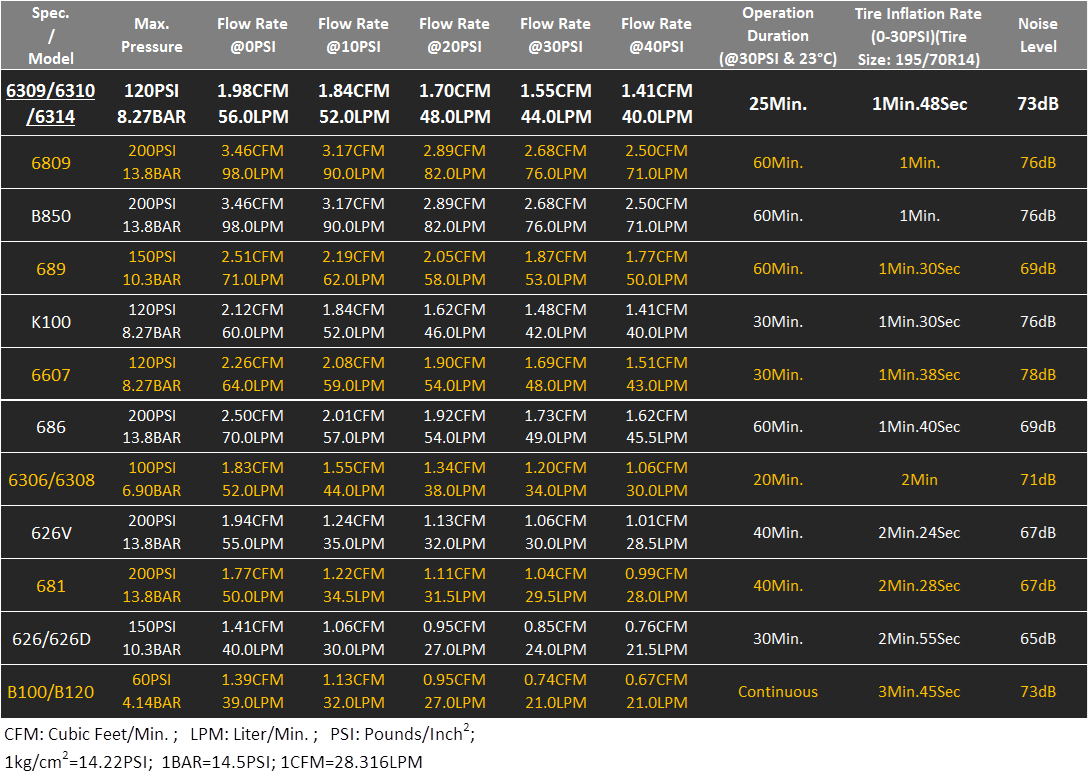 195/70R14 tire inflation rate: 1Min.48Sec (0~30PSI) Thermal protector