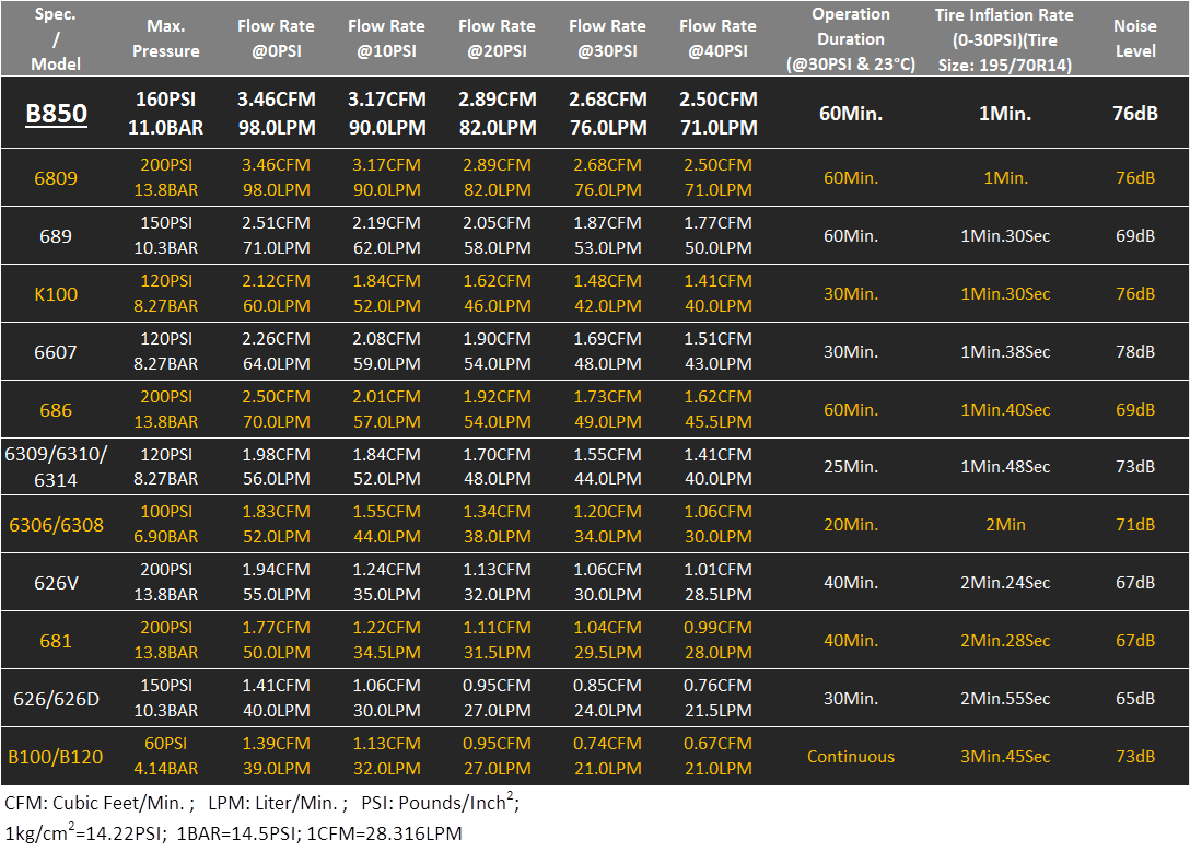 B850 id the air compressor / tire inflator that mounted in a durable case offering easy carrying and storage. With LED backlight intelligent Auto-stop analog pressure gauge. Dual battery clamps with in-line fuse. 25 ft versatile extension coil hose with in-line pressure gauge that inflating and deflating device. High performance PTFE piston ring. Anodized aluminum alloy cylinder. With automatic reset thermal overload protector.