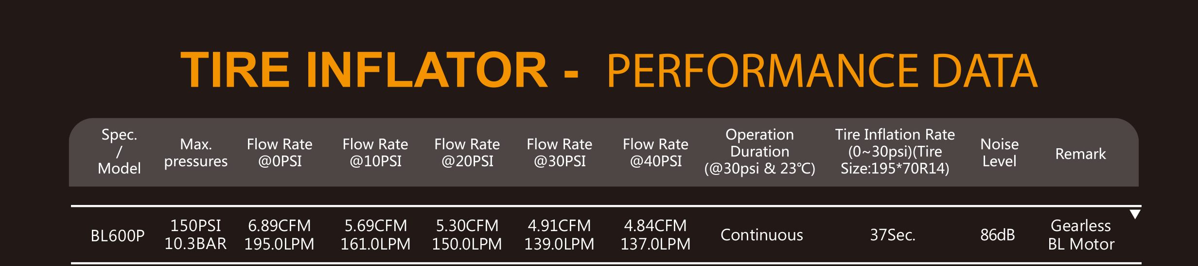 BL600PD is a high-flow portable compressor with brushless DC motor motor. 1. 195L/Min. Max high air flow provides fast inflation experience. 2. Smart pressure gauge stops automatically when filling up or letting air out. Accurate within 1 PSI. Easy buttons to change between different pressure settings. 3. Advanced brushless motor works efficiently, needs no maintenance, and lasts longer. 4. Improved cooling system for better performance. 5. Built-in safety feature that prevents overheating damage. 6. Quiet operation with minimal vibration. 7. Complete protection against dust and water when not in use (IP65 rated).