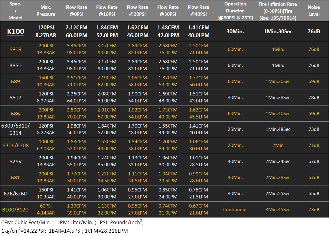 K100 is the air compressor / tire inflator that with Direct drive twin-cylinder and twin-motor,low power consumption,super powerful,Never-failing function. Dual battery clamps with 30A inline fuse,safe and reliable. Anodized aluminum alloy cylinder. High performance PTFE piston ring. 25 ft coil hose with in-line pressure gauge for inflating and deflating device. Easy storage for power cord、battery clamps and accessories also convenient to carry.