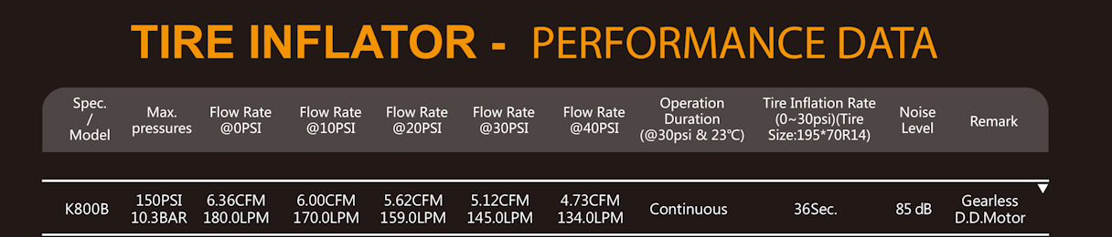 | 35"*12.5"*R15 tire inflation rate | 3Min.39Sec.(0~40PSI) |