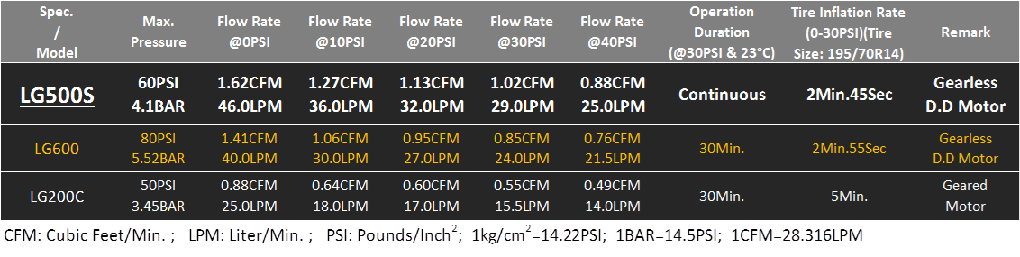 LG500S is the air compressor / tire inflator with new style linear precise pressure gauge,easy to read,with over-pressure protection. Pressure gauge comes with LED backlight,convenient for reading at night. Upgrade power cord,cigarette lighter plug with 15 A fuse. Highly efficient work light,easy for working at night. With inflation kit holder for neat storage. Built-in cooling fan with spiral air outlet,provide high efficient cooling to the motor, to ensure the deflate device can continuous wor