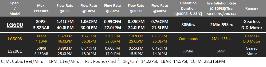 LG600 is the air compressor / tire inflator with new style linear precise pressure gauge, easy to read, with over-pressure protection. Pressure gauge comes with LED backlight, convenient for reading at night. High performance stainless steel flapper valve. PTFE piston ring 5.Cigarette lighter plug with 15 A fuse. World patent.